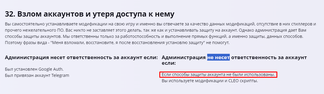 После пишет: " Очень странная ситуация по итогу получается, но согласно 32му пункту правил, ответственности за утерю аккаунта без установленной защиты мы не несем. В день сбоя можно было просто дождаться исправления всех неполадок, без отвязки телеграм-привязки, будет уроком. Разбанивать аккаунты я не буду, тебе могу лишь посоветовать сменить в таком случае сборку и играть на чистой, вероятнее всего ты сидишь на стиллере "