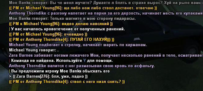 Добавлю пару слов к персонажу Мои. Этот парень начал в клубе, три раза он проигнорировал мои отыгровки что я его с другом оттаскиваю от толпы, после он начал кидать предьявы типо. Эй нахуй, пошлите выйдем ебать, вы че псы бродячие ахуели. В общем говоря матерился на чистом английском+во время ихней ситуации в клубе он сам к ним доебался, я подошёл как охранник спросить че такое а он мне ответил. *А че твоего кента кенты ебливые долбаебы?* Если найду скрины, скину.