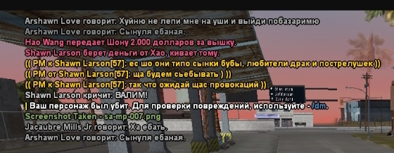 Кент предупредил, начали сваливать. В своё оправдание скажу, что вы не в центре города пытались мне булочку продать за пару баксов. Вы в бедном районе обманули человека на 2.000 долларов , для кого то это деньги для существования. Наркотрафик в гетто, фракции... Будь я игроком чёрной фракции, то шотнули бы и вашего кента, но, нет. Играл в округе не малое время для того, что бы щас на форуме написывать тебе, за что ты получил пулю. В следующий раз, когда будешь пытаться обмануть другого цивила на пару тыщ баксов просто уехав на машине, думай лучше.