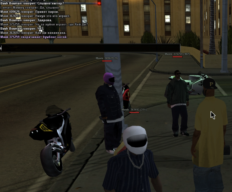Суть жалобы: Приходим на район, начинаем игру, спрашивая за музыку. После Bash отыгрывает, что стреляет мне в колено, а по факту добивает в голову, в то же время начинает стрелять Lamarr без отыгровок. Пришли мы туда без оружия, агрессивно вел себя только я, но это не причина шота точно. Также после убийства стрелки продолжили стоять на прежних местах и вели себя спокойно. ПГ и убийство без весомой причины.