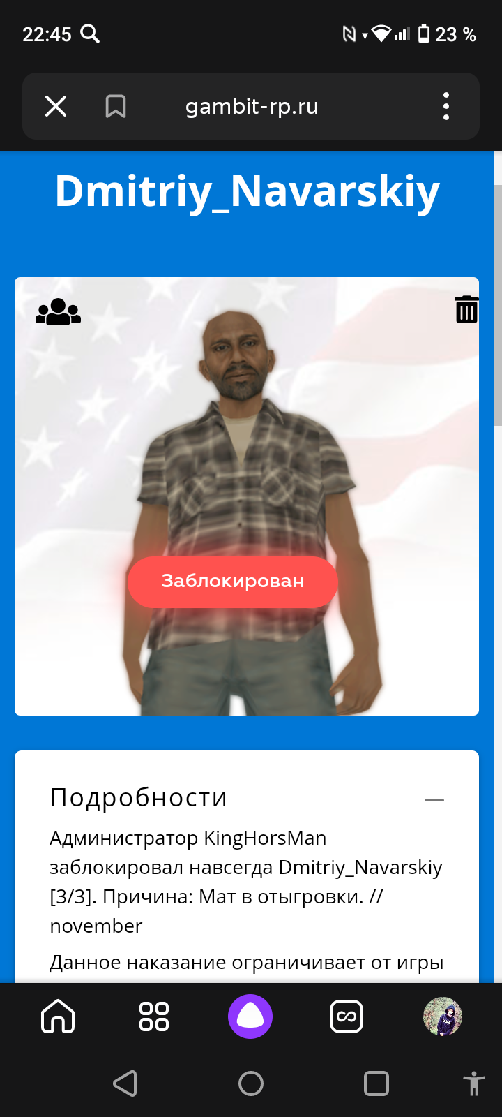 Суть жалобы: Спустя год вернулся на проэкт, купил лицензию на оружие и через два дня решил сменить персонажа, купил смену ник-нейма. За год игры забыл про бывшие выданные мне преды, после чего получаю бан на всегда за мат в отыгровке. Прошу амнистировать, признаю вину, но считаю что вполне можно было не давать перманентный бан.. Действительно обидная ситуация, не хотел кому-то навердить своей игрой в самом деле, лишь забыл про правила о матах в отыгровках, однако за двое суток потерял около 400-500 рублей, что тоже вообще не радует. Хочу получить амнистию, соответственно к администратору притензий нет.