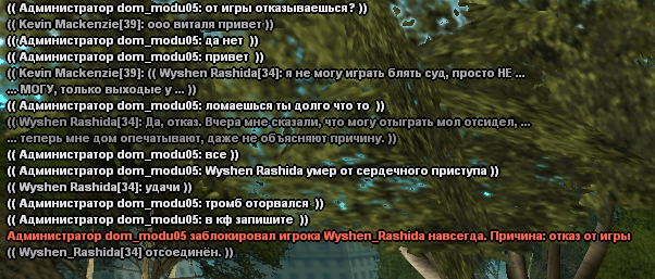 Вынесу для себя лишь один жизненный урок, буду более холодным к людям и перестану проявлять сострадание к каждому второму. Ты должен был сидеть в КПЗ до игры с детективами, как это делают остальные игроки, но ты мне сказал, что мало играешь. Я пошёл к тебе на встречу и освободил тебя, предупредив о том, что игры мы не откатываем и дело продолжается. Сегодня с тобою даже не играли, мы проводили обыск твоего жилища, в рамках досудебного собирания доказательств отделом ГЦУ, ты вломился со своим OOC и написал 4 раза о том, что отказываешься играть. Как итог, я тебя предупредил о том, что у меня есть желание играть далее и пошёл в тимспик к администрации, которые оперативно сработали и выдали наказание, согласно правил проекта Gambit RP. Какие могут быть вопросы?