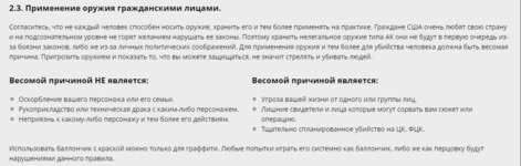 2.3 пункта правил, о "Применении оружия гражданскими лицами", в нем не говорится КОНКРЕТНО о применении лицензионного оружия ГРАЖДАНСКИМИ (к которым ТЫ и относишься, поскольку не являешься игроком SA-ES или одобренной/официальной криминальной организации) лицами. Данный пункт, в целом, описывает то, в каких случаях разрешено использовать оружие.
