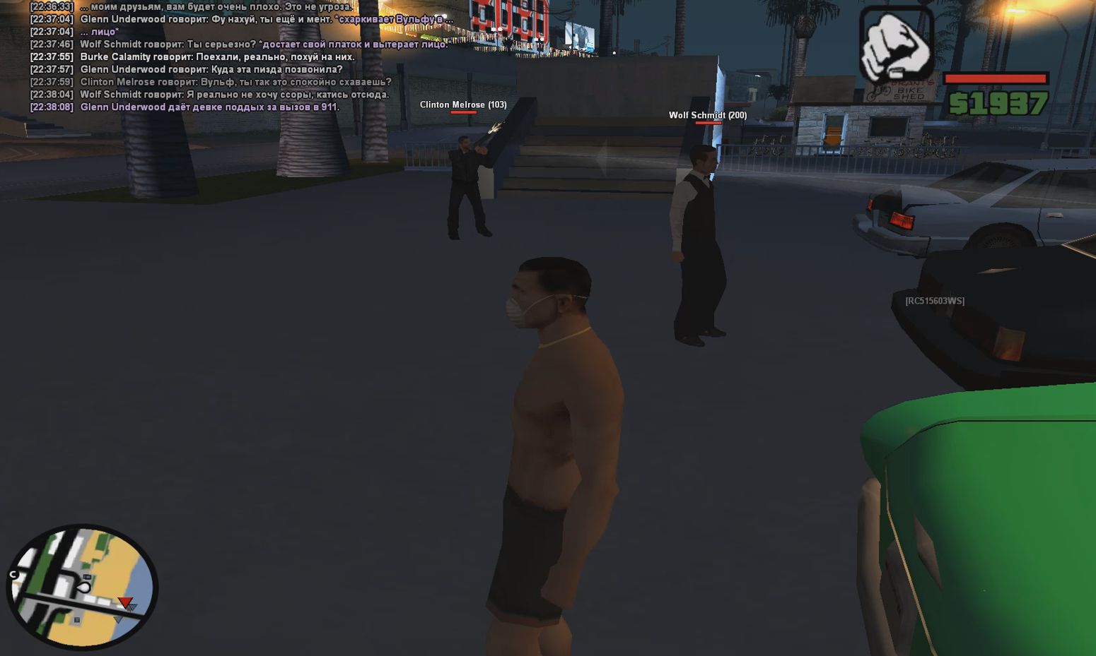 Всё начинается с того, что я вижу с моим другом как подьезжает зеленное авто к нашему бару и кружит в его районе. Мы на тот момент ждали нашего сотрудника Клинтона, который участвовал в игре с нами. Мой персонаж решает подшутить над парнем, который всегда в ответ шутил над моим персонажем. Я кидаю отыгровку в ic чат "Этот тот, который придурок? АЛЛО.", и выходят дартаньяны из тачки. Начинают играть, что якобы мой персонаж решил высказать в сторону двух парней данную фразу. Но на самом деле нет. К тем ребятам даже не было интереса, чтобы потратить своё время.