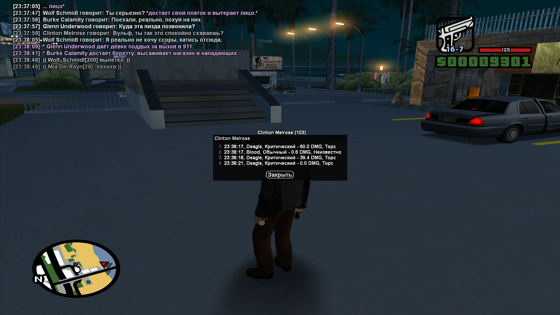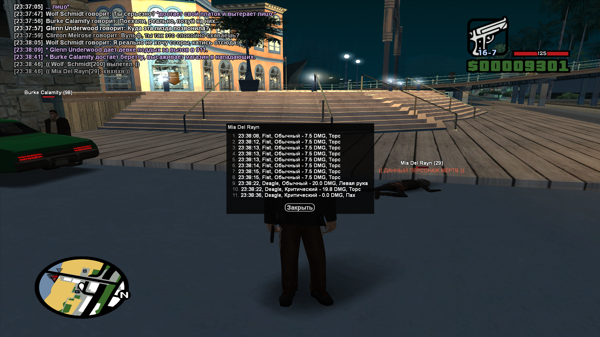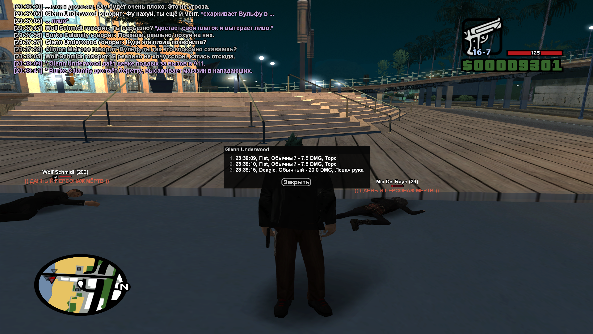 А сначала хотел написать /call 911, но передумал т.к. в ic не хотел отыгрывать это и не кидать вызов в 911. Наш Glenn Underwood решил обыграть /ame, которое стоит автоматом при использовании /call [номер] и решил обыграть всё так. "Куда эта пизда позвонила?" (могу скинуть скрин чата, если требуется.), и ударяет меня сначала системным ударом без отыгровки, я ему в ответ удар так же, не расценивал это как ic драку или даже системную. Его друг достает пистолет и начал стрелять из дигла, по челам, которые не вооруженные. Glenn тоже достает пистолет и отвечает огнем в нашу сторону. Этог - 3 рыла и в от 2-й до 3-й стадии.