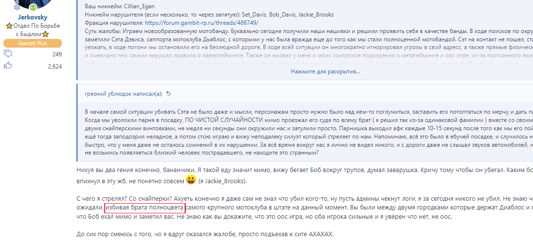 Суть жалобы: Играем новообразованную мотобанду. Буквально сегодня получили наши нашивки и решили проявить себя в качестве банды. В ходе поисков по округу мы заметили Сэта Дэвиса, саппорта мотоклуба Дьяблос, с которыми у нас была вражда еще до того как мы стали полноценной мотобандой. Сэт на контакт не пошел, стал от нас уезжать, в ходе погони мы остановили его на безлюдной дороге. В ходе всей ситуации он многократно игнорировал угрозы в свой адресс, а также прямые физические увечия, и очевидно тем самым нарушал правила о павергейминге. Также он вызвал у меня и моих соигроков подозрения о метагейминге и оос игре, из-за постоянного выхода в афк и собственно развязки ситуации. Каким-то образом на горизонте обьявились его поддельники, хотя вполне очевидно, что он никак не мог сообщить им о своем местоположении в IC. Итого: PG от Сэта Дэвиса, MG(OOC игра) от Сэта Дэвиса и его соигроков-стрелков.