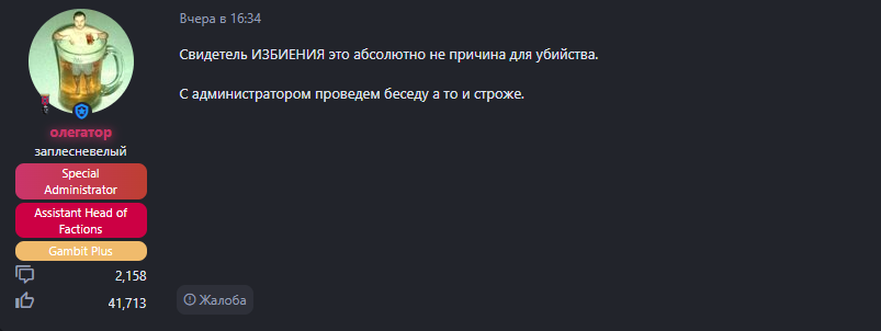 Суть жалобы: мне вот только недавно сказали в другой жб, что свидетель избиения никак не причина для убийства, и отклоняют жалобу, можно мне точнее узнать?