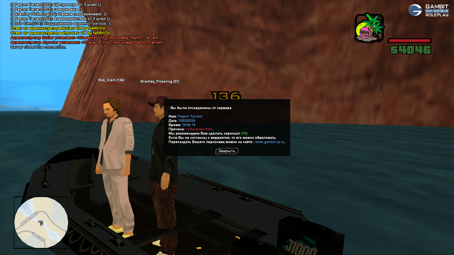 При всем уважении, Порус, какой бы Пэйтон не был дурачок, это не повод уже ЧЕТВЕРТОГО его персонажа по итогу отправлять в ЦК, это слишком. Может ты и не знал. На будущее, что тебе, Брэнтон, что тебе, Порус, обходитесь без меддуусобиц, там более доходящих до ЦК друг друга, мы все семья, если есть вопросы касательно игры Пэйтона - жалуйся на него, на него жалоб и так дохуя, но сносить уже четвертого персонажа за время игры с нами малому, это реально жесть, азазха, вызывает у меня лишь респект за такое рвение к игре с нами.