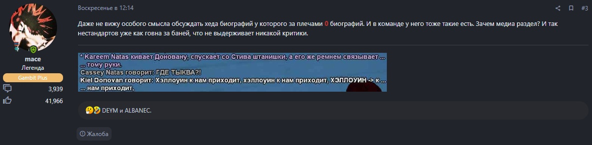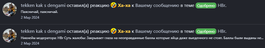 Суть жалобы: Без моего ведома я был занесён в таблицу ЧС биографий главой раздела "tekken kak s dengami" за некое "неадекватное поведение" и "токсичную личность". Прочитав правила раздела биографий, я нашёл лишь один пункт, по которому можно получить ЧС биографий, и это за злостные нарушения в игре, в статусе нестандартной роли.