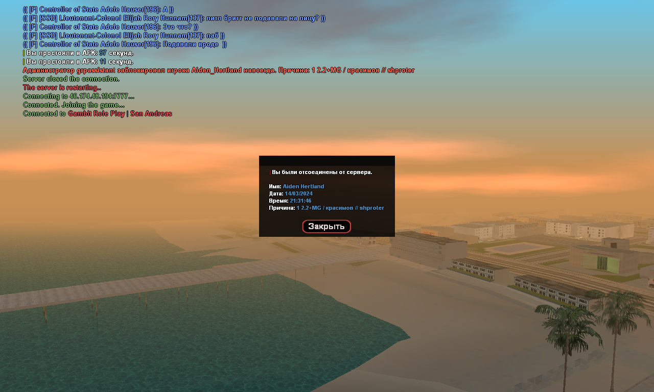 Суть жалобы: Первоначальная причина остается такая же 2.2pp, MG. Которая была выдана через Шпротера. Вообщем какой то бред, так и не разобрался. Могу открыто заявлять что данные администраторы заблаченные сидят на админках и считают если они имеют этот вес, то они не должны играть. Обьясню теперь сегодняшнюю ситуацию. Ноябрь, то есть игрок Yuko_Miura p.s администратор, он подготовился ко встрече департамент коммерции прочитал каждую квенту персонажа и по ней играл и выводил нас не только на эмоции но ещё и использовал слабые стороны наших персонажей. В итоге с несоответствие роли я согласен, но как я об этом узнал. Перейдём к МЭРУ, который каким-то хуем присосался к департаменту коммерции и был наглядно послан нахер лишь из-за одной причины "зачем ты здесь", после чего я вижу сразу же как он пишет "БАНЬ его". Учитывая масштабы разборок все же мы оказались правы в данной ситуации. Но подведу кое какой итог в плане IC.