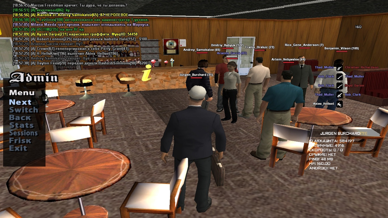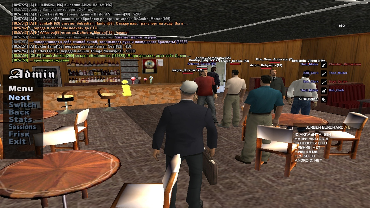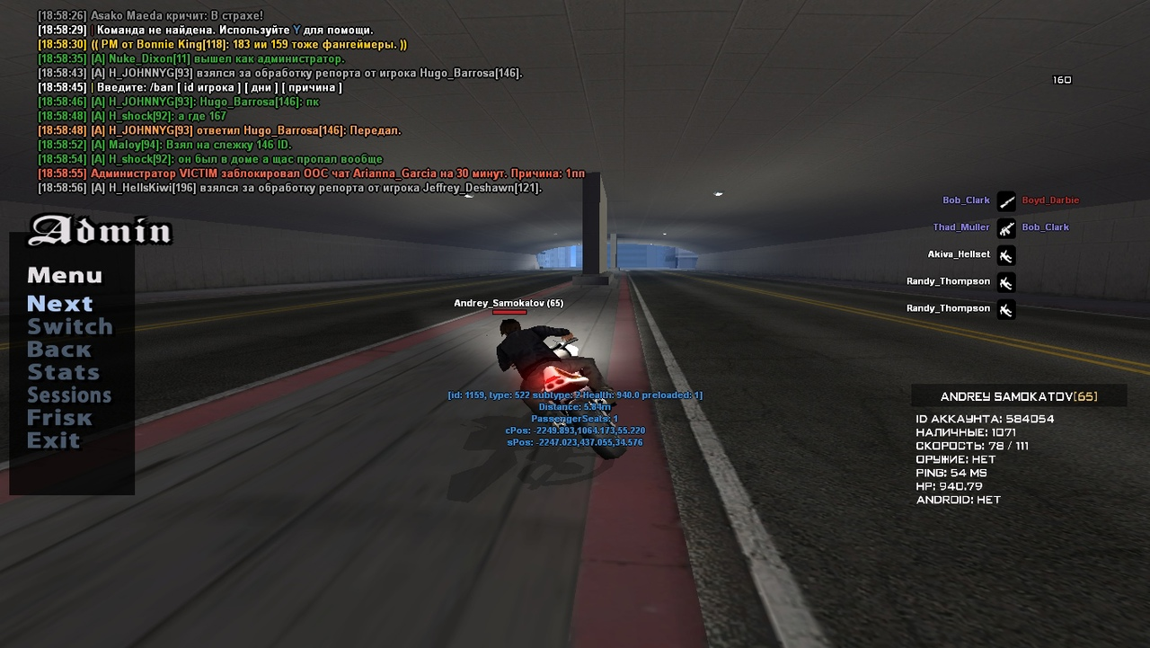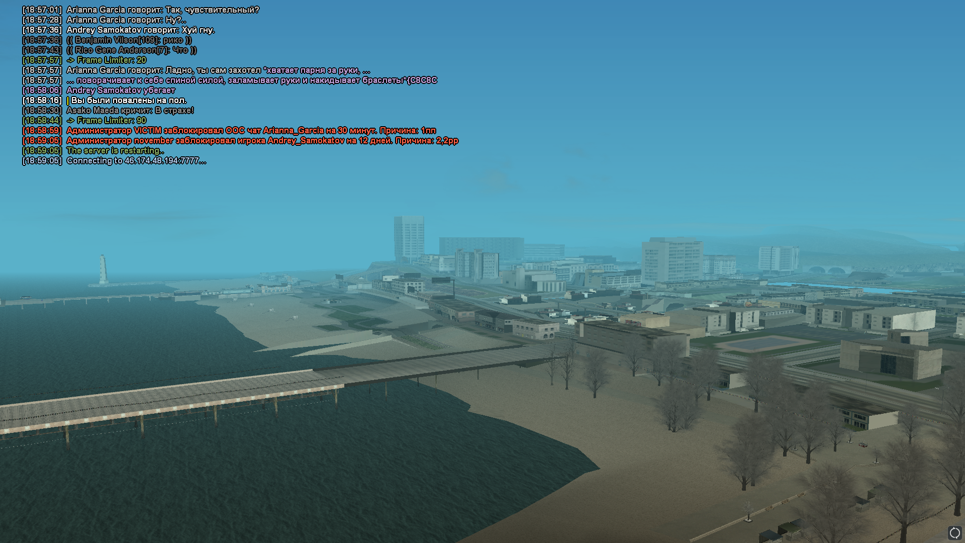 Суть жалобы: Такое ощущение что админ november меня банит постоянно чисто по приколу какому то. На этот раз к нам в бар зашли 4 неадеквата в аттачах и начали пороть хуйню, были посланы далеко и надолго, после этого они позвали своего кореша из сфпд и решили меня повязать. Он меня забанил за 2.2, я просто убежал от ебанутой офицерши которая на протяжении минут 30 стояла ПЕРЕШЁПТЫВАЛАСЬ со своим корешем который якобы из правительства но почему то не состоит в организации??и ничего внятного в чат не писала, после чего и вовсе решила меня ЗАЛОМАТЬ СИЛОЙ(да ну нахуй??), я естественно убежал, сел на мотоцикл и уехал, а что мне ещё делать?