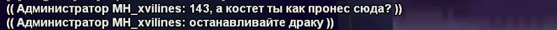 Суть жалобы: Ну тут дефолт ситуация. Захожу я значит в бар побить белых, а тут админ решил поплакать мне. Вижу металлодетектор, играю что он сработал, минуту жду, две минуты жду - тихо. Захожу будучи отыграв что детектор заорал как бешенный - поебать. И тут этот бомбоклат пишет мне мол что бы я убрал кастет, я пишу иди нафик, он молчит. Вижу как моего друга пинают и влетает, этот помидор бомбоклатович даёт бан даже не доиграв ситу. Между прочему у типа там был антистан, а ему п о е б а т ь. Главное задушнить и меня откинуть. По поводу драки кстати, я бы очень много времени потратил на то что бы снять кастет, бля я его даже не играл он просто аттачем висел.