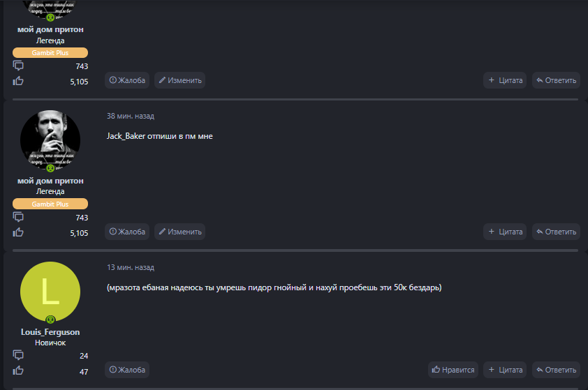 Ну, приветствую. Убил я парнишку с причиной, я являюсь игроком ОДОБРЕННОЙ фракции ~~> https://forum.gambit-rp.ru/threads/490722/ , решил наколоть парня на нож, тот в свою очередь начал изрыгать проклятия и угрозы мне в PM форума: