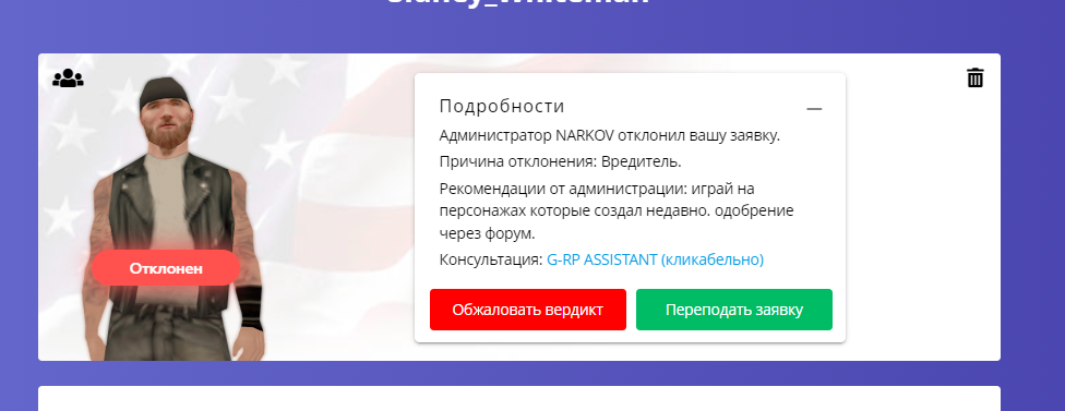 Суть жалобы: и почь мне отклонили перса?)))) Я получил бан один и всё, акки создаю что бы поиграть нацика. Я больше скажу, я хочу ещё двух создать под копов. Прошу одобрения ибо нарушений с моей стороны сильных не было и роль хочу поиграть прикольную, ага.