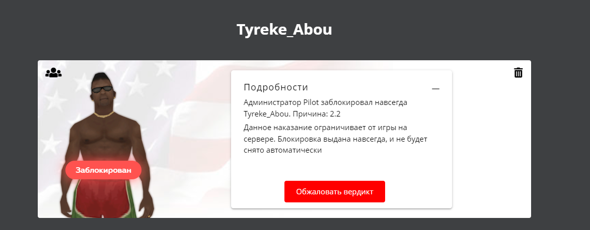 Суть жалобы: ЗДРАВСТВУЙТЕ, ДРАЗНИЛ ТУПОГО (ОН РЕАЛЬНО ТУПОЙ ПО АЙСИ, ПО ООЦ НЕ ЗНАЮ) ПОЛИЦЕЙСКОГО В ГЕТТО НАХОДЯСЬ ЗА ЗАБОРОМ ВО ВРЕМЯ ПЕШЕЙ ПОГОНИ,, Я НЕ БАЙТИЛ ЕГО НА ПОГОНЮ ОНА УЖЕ ПРОИСХОДИЛА ОТ ДРУГОЙ СИТУАЦИИ. ПРИЛЕТЕЛ ВЕЧНЫЙ БАН ЗА 2.2. ОФИЦЕР ДОЛЖЕН БЫТ ЬМОРАЛЬНО УСТОЙЧИВЫМ, ЕСЛИ ОН ТУПОЙ И НЕ МОЖЕТ ЗАДЕРЖАТЬ ПРЕСТУПНИКА ЕЩЕ И ПОДДАЕТСЯ ПРОВОКАЦИЯМИ И НАЧИНАЕТ БЕСПОРЯДОЧНУЮ СТРЕЛЬБУ, ПРОСТОЙ НЕГР В ЭТОМ НЕ ВИНОВАТ. Я БЫЛ АРЕСТОВАН ЕЩЕ НА КОЛЬЦЕ ГЕНТОН, НО В СВЯЗИ С ТЕМ ЧТО ОН ТУПОВАТ, Я ОКАЗАЛСЯ БЕЗ НАРУЧНИКОВ У АЙ ПИЦЦЫ ВО ВРЕМЯ ПЕШЕЙ ПОГОНИ. СЧИТАЮ НАКАЗАНИЕ НЕСПРАВЕДЛИВЫМ И ВЫДАННЫМ НА ГОРЯЧУЮ ГОЛОВУ. В США БЛЯ ЭТИХ ПОЛИЦЕЙСКИХ РАССТРЕЛИВАЮТ В УПОР, ВЫ ТУТ ЗА ОСКОРБЛЕНИЕ БАН ВЫПИСЫВАЕТЕ