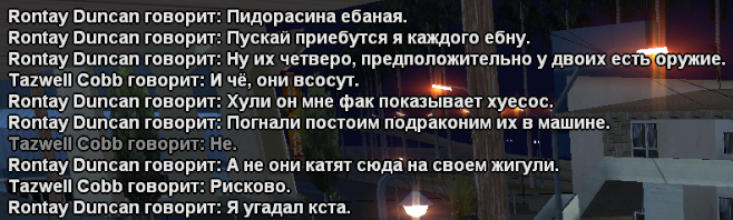 Суть жалобы: Хочу услышать причину убийства, ведь в отыгровке она не была указана, типы приехали и просто так перестреляли нас. Мы ранее не имели с ними взаимодействия, не встречались лицо к лицу. Так-же подозреваю пацанов в использывании кам-хака для просмотра нашего текста, ведь если близко подвести камеру к персонажу то будет виден ТЕКСТ НАД ГОЛОВОЙ. Так-же типочки нарушили (багоюз) стреляли с зажима