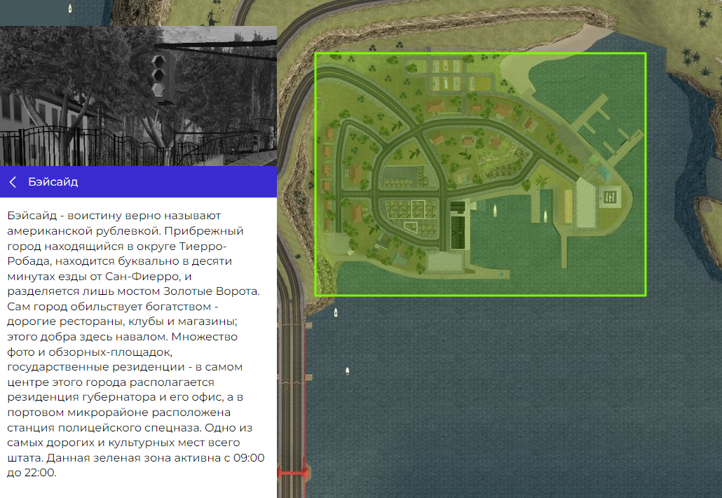 Вот он, интересующий нас Бейсайд. Обратимся к его описанию, а именно - к последнему предложению, описывающему время, когда зелёная зона активна. С девяти утра до десяти вечера.