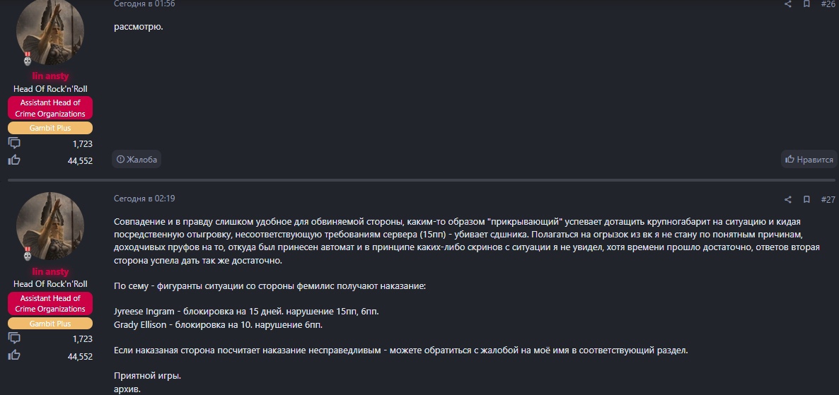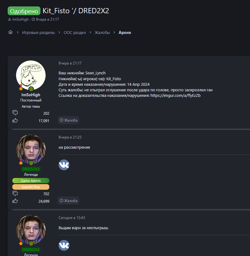 Суть жалобы: если я буду расписывать все конкретно, то на это уйдет 10 страниц, поэтому я скажу кратко лутерство фангейм дм стрельба без отыгровки лив от ситы самохил стрельба при тех драке нахуй и дохуя дохуя всего, огромное спасибо администрации в игре которой /rep орали обо всей этой хуйне и парочку из них были наказаны. Но каждый из перечисленных аккаунтов заслуживает пермача а мб и нахуй чс, решайте сами.