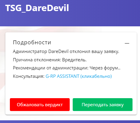 Ну наверное ник тсг дейрдевил... ну а еще я тебя отклонял потому что 4 аккаунта в бане, а мы такие одобрять не можем. Ток через форум.