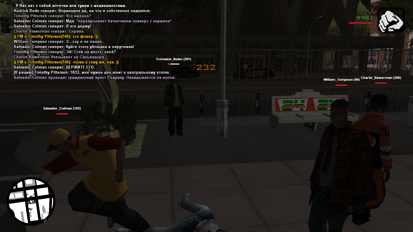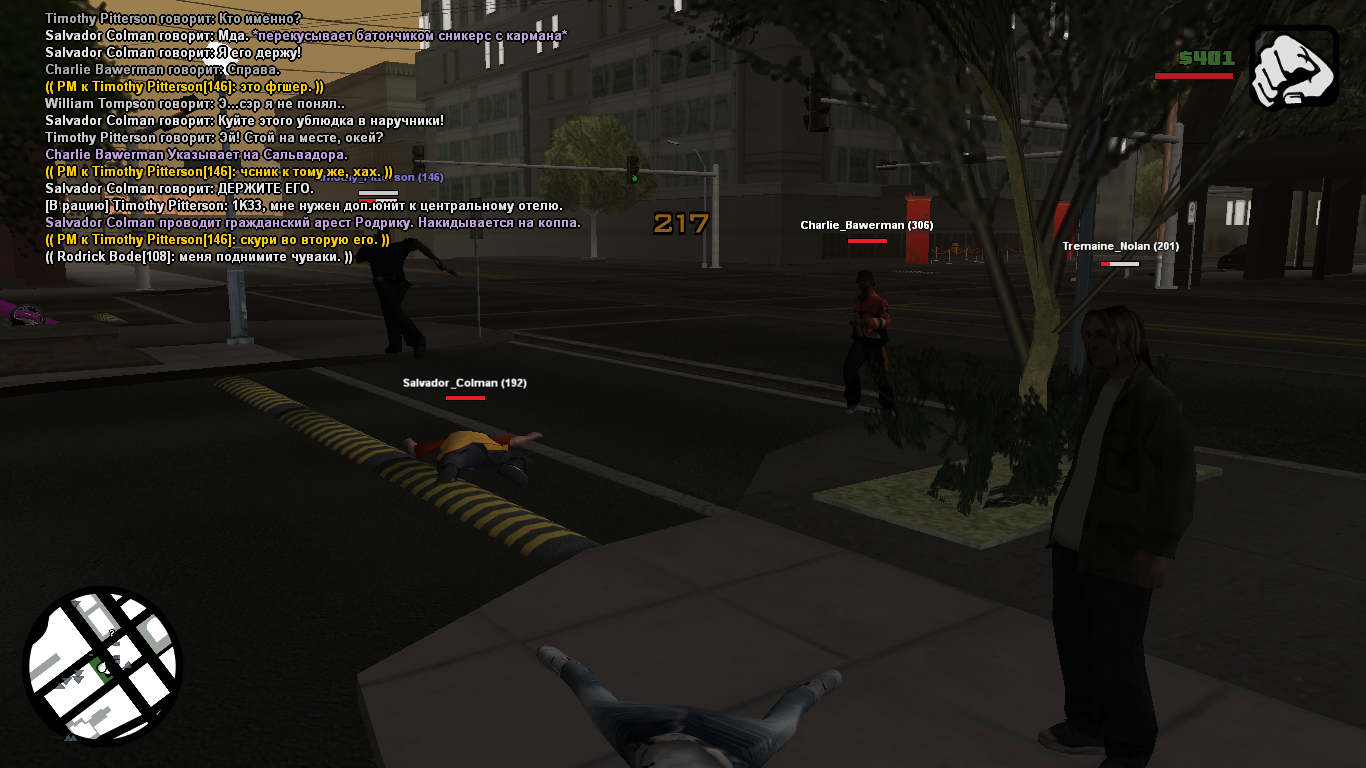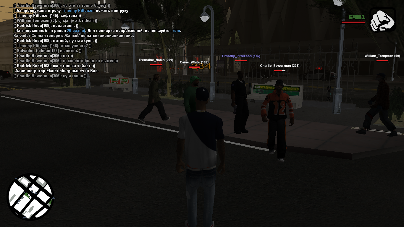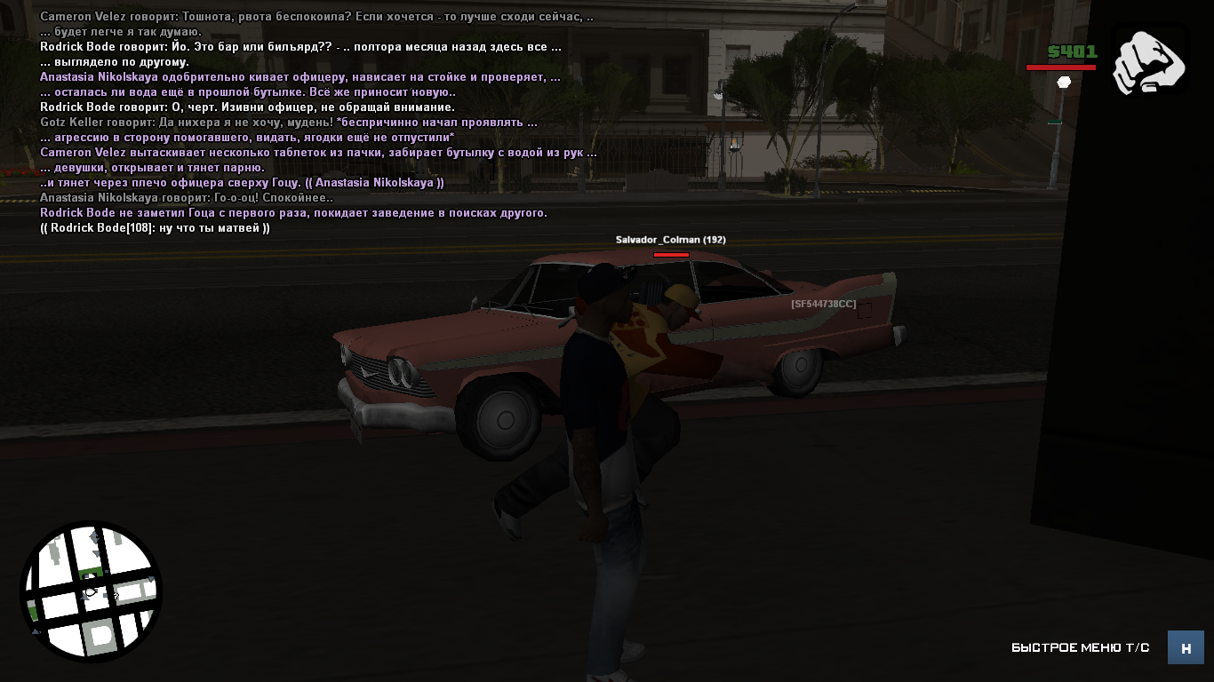 Играли ситу вдвоём, никого не трогали. Тут подъезжает этот игрок и выдаёт то, что видно на скринах. Угрожает баном, далее вырывает отыгровку "Salvador Colman банит игрока.", начинает меня избивать. Зову админов, не успевают. Не виню их. Прошу наказать игрока.