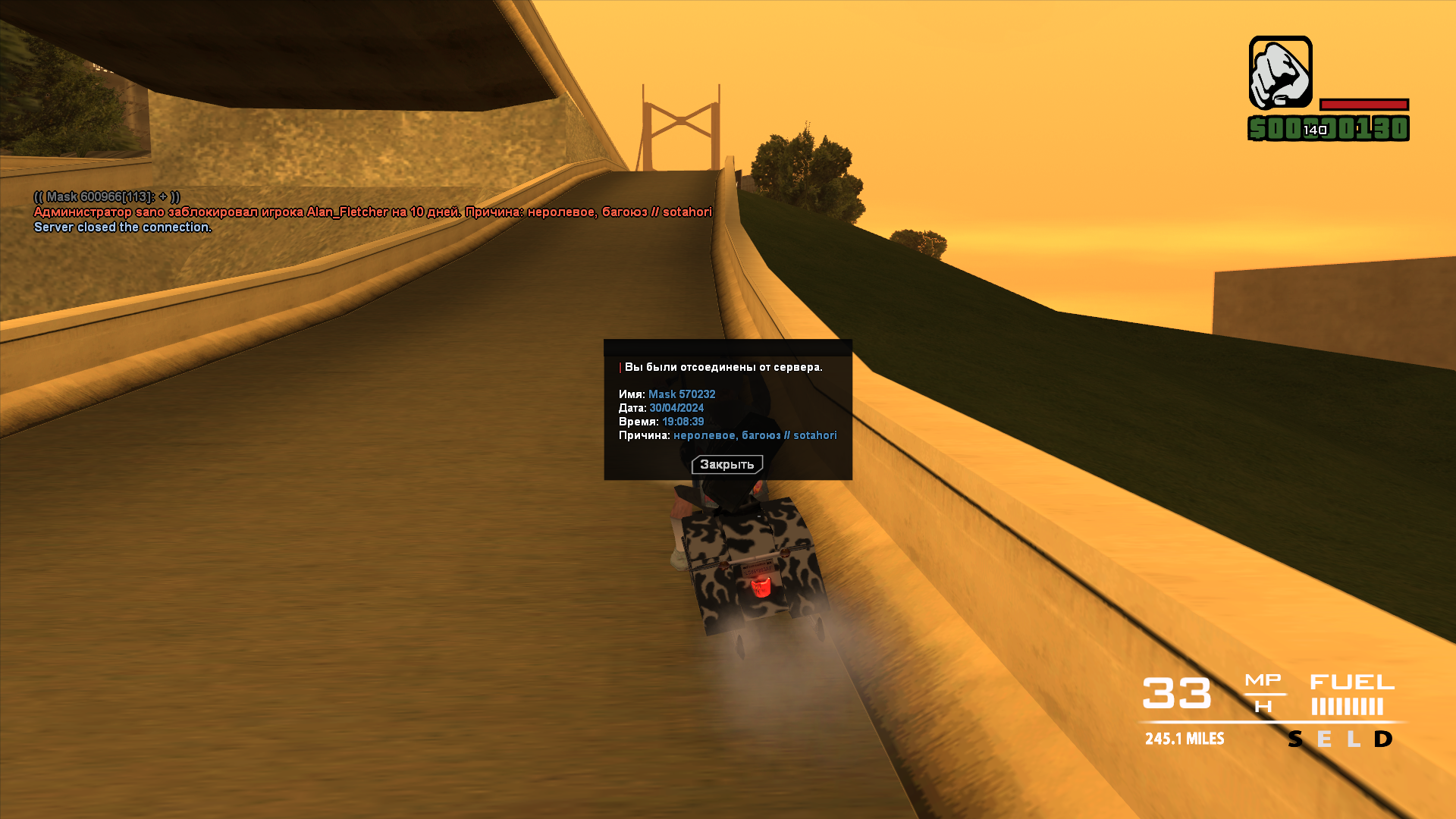Суть жалобы: Во время отыгрыша данный администратор заблокировал меня с причиной багоюз, а так-же не ролевая игра. С первой причиной я не спорю, так как в момент спешки пытался максимально быстро разогнаться на байке, так как за нами могли увязаться копы. Однако со вторым в корне не согласен. На протяжении всего дня мы готовились к ограблению, и когда мы его отыграли, и сделали из этого сс меня заблокировали. Прошу пересмотреть данную жалобу, чтобы мы могли спокойно доиграть её.