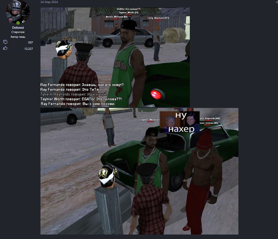 Человек которого я обоссал, улетел в бан, или ЧС проекта, или еще хуй пойми куда, вместе с своей фракцией, которые играли ручных мартышек с диглами, наебали тех. администрацию с варзоной, и еще много шалостей. На ситуации данной, он убил четырех моих соигроков, и да, я его обоссал, я этого не стыжусь, и обоссал бы еще раз. Это вредитель площадки, что я тебе докажу, если ты напишешь в ЛС, и мы обсудим все вопросы касательно нашей игры.