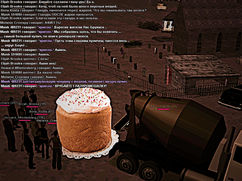 Привет проверяющий! Сегодня второй по важности христианский праздник, так что для укрепления дружеских отношений в составе моей фракции, я решил позвать всех игроков печь куличики, да в дружном круге похудгеймить приятненько, не вижу в этом какого-то ужасающего нарушения, обычное милое шаловство для состава. Отвечу пока кратко по пунктам, которые ставят в обвинения нашей фракции ~~~>
