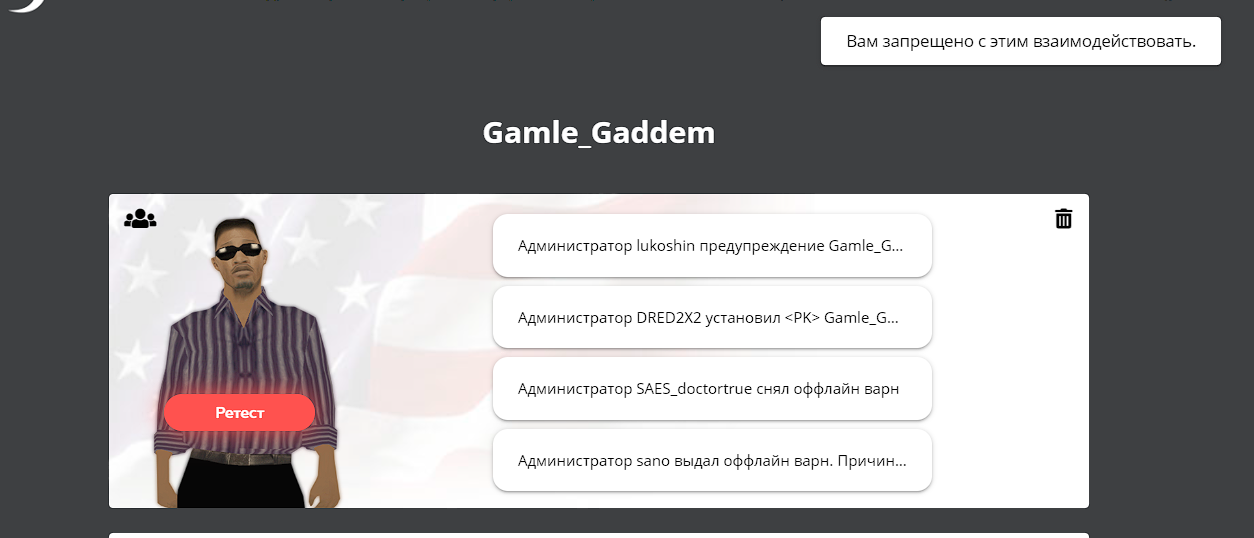 Суть жалобы: Привет. Не могу пройти ретест из за блокировки лк???? (Был договор, что я буду не получать баны за бредовую дичь). Баны получал, но я их легко обжаловал, тоже самое и с варнами. Разве что получал 2 раза де Морган за баннихоп и за спринт(1 раз по случайности ксмоук дал дмг) и вот я получил варн за оскорбление администратора. Я старался обойти ретест, но никак не могу в данный момент его, даже пройти его не получается. А также высокое презрение со стороны администрации ко мне, как к игроку, потому что они видят мои блокировки выданные тобой, и думают обо мне в плохом контексте. А том, что я злостный нарушитель. Я частично согласен с этим, но нарушаю я не от пизды, а потому что не могу контролировать барьеры, как сейчас например. Можете снять варн, или что делать в данном случае?