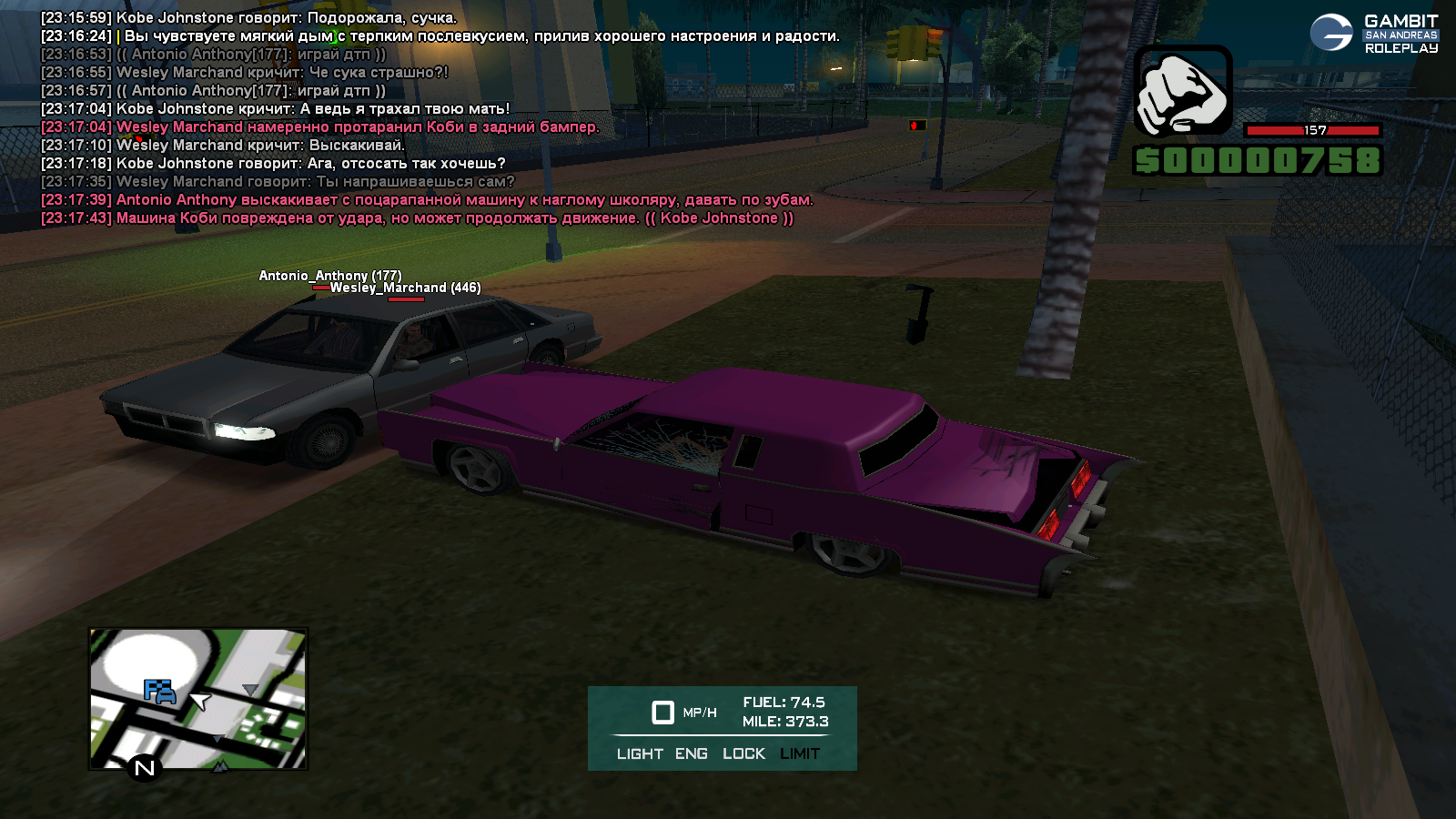 первое столкновение с этим игроком что пытался от меня скрыться, я отыгрываю как протаранил его в бампер, не шибко и большая скорость, он нуль реакции, стал дальше нести бред про отсосы в сторону моего персонажа.