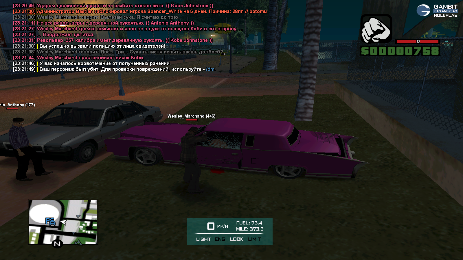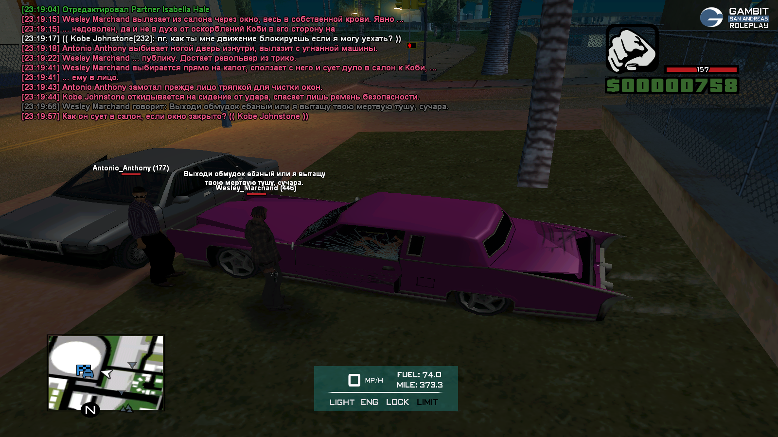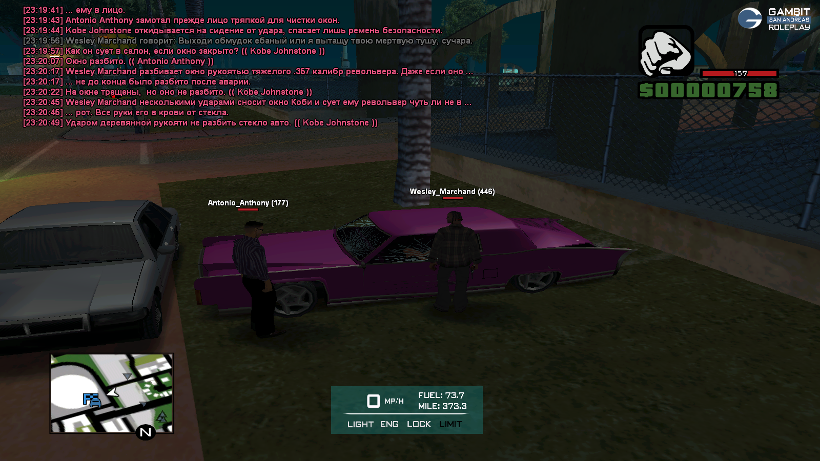 Ну как играть... Я отыгрываю что мой персонаж весь в собственной крови и уже на исходе, вылезаю через окно, ведь дверь то у меня упирается в его автомобиль, угрожаю ему. Он мне отыгрывает в ду что окно закрыто, оно технически было разбито, так и по логике после улёта в дерево. Я не растерялся и отыграл как разбиваю рукоятью револьвера ему остатки стекла и опять же режусь. Смотрите его же скрины, от него отыгровки своего персонажа просто - нет. Он только отыграл то, что у него стекло охуеть какое прочное и нельзя его видать разбить. Ни одной реплики, реакции на происходящее.