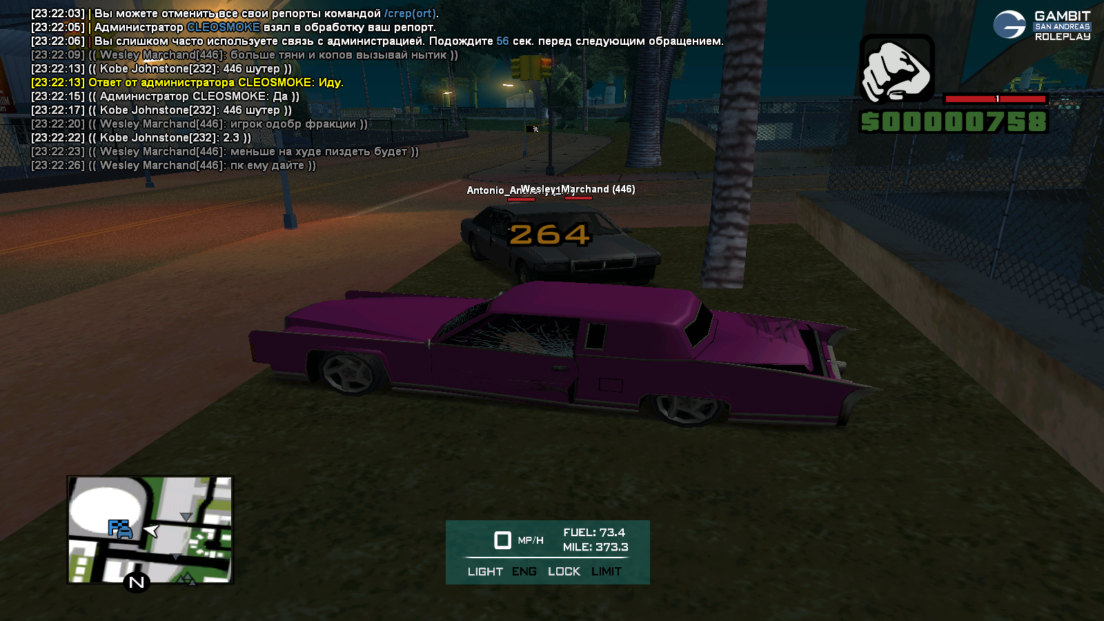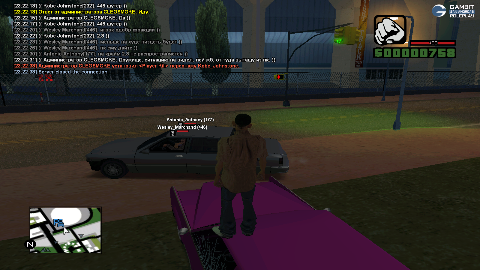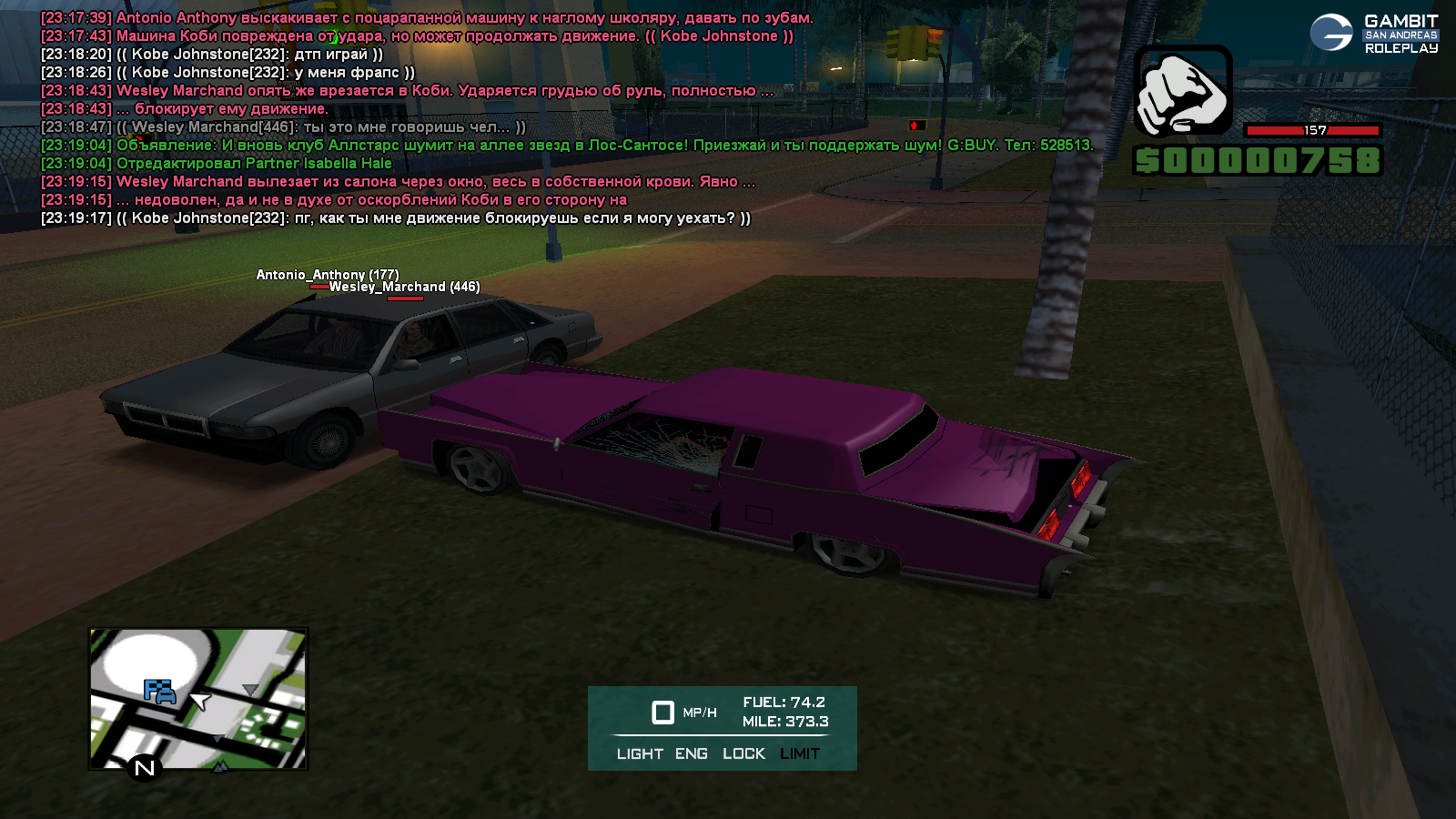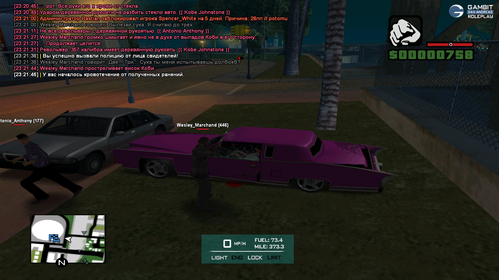 Ну как играть... Я отыгрываю что мой персонаж весь в собственной крови и уже на исходе, вылезаю через окно, ведь дверь то у меня упирается в его автомобиль, угрожаю ему. Он мне отыгрывает в ду что окно закрыто, оно технически было разбито, так и по логике после улёта в дерево. Я не растерялся и отыграл как разбиваю рукоятью револьвера ему остатки стекла и опять же режусь. Смотрите его же скрины, от него отыгровки своего персонажа просто - нет. Он только отыграл то, что у него стекло охуеть какое прочное и нельзя его видать разбить. Ни одной реплики, реакции на происходящее.