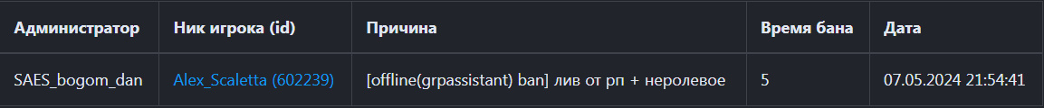Дата и время наказания/нарушения: 7 Май 2024