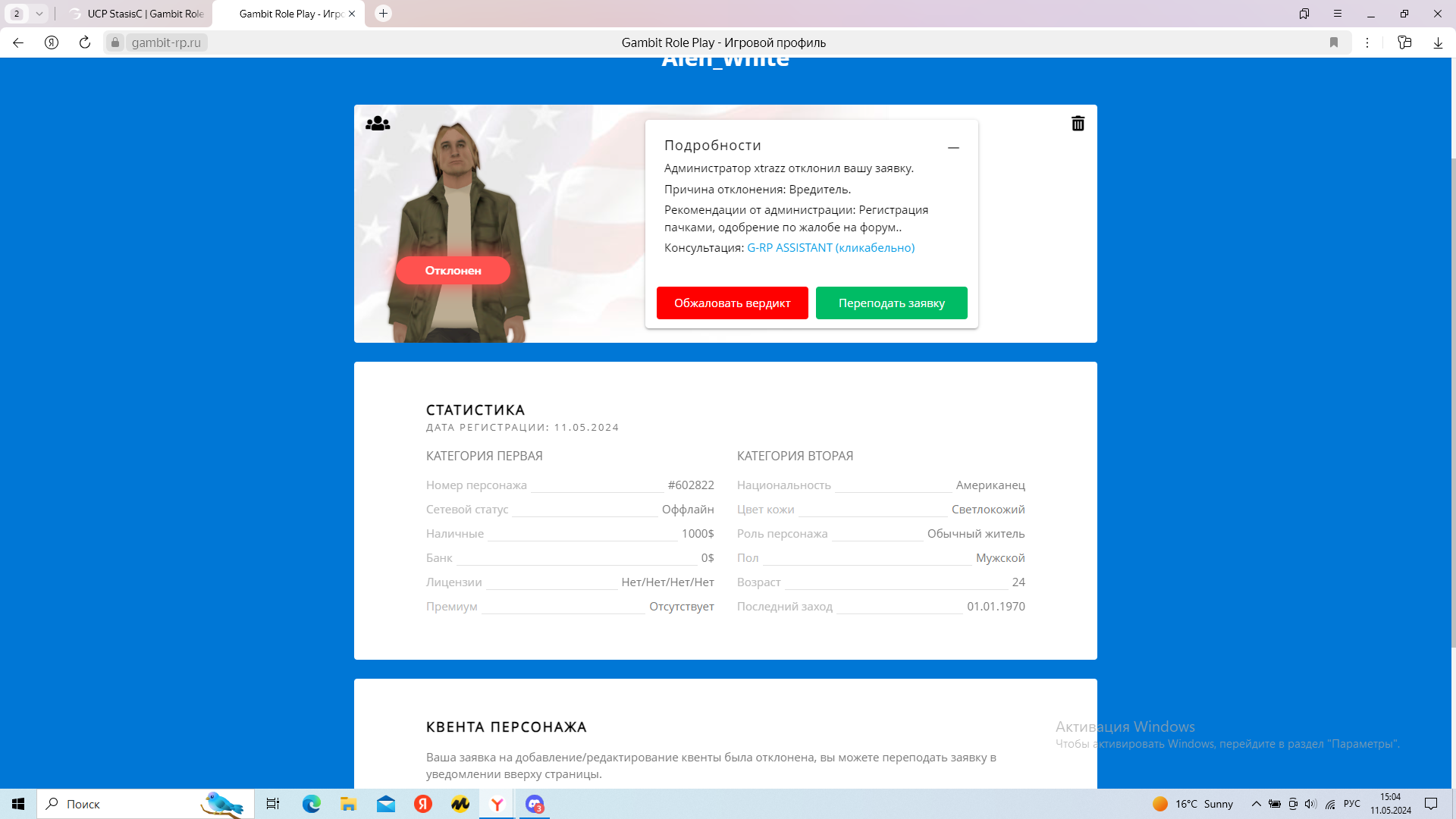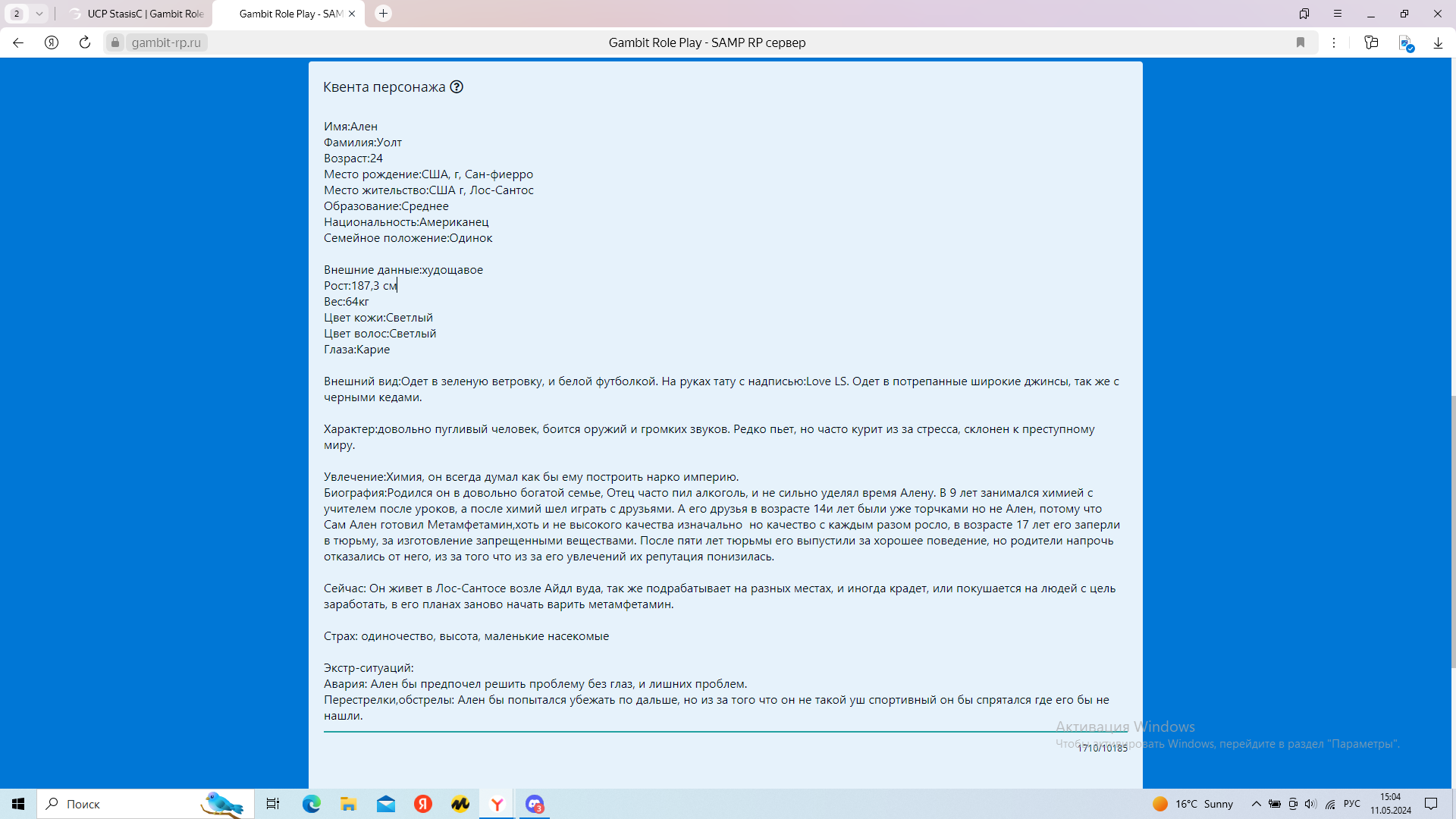 Суть жалобы: Я не понимаю этого администратора я написал квенту по всем аспектам минусы плюсы проблемы ситуаций но они отказывают не понимаю вашу проблему вот сейчас я и вставлю эту квенту Alen White - 24х летний молодой парень со светлыми волосами. Семья Алена была кучкой аферистов Лос Сантоса жившими не лучшей жизнью, а оттуда же красноречие Алена. Детство Алена было сложной, из за того что ему приходилось красть все что его семье нужно, его в детстве не воспринимали как ребенка, а как скорее как работника который будет приносить вещи. Из за жизни Алена и нехватки еды у него худощавое телосложение, также высоким ростом, но еще ему не хватает кальция из за этого он много ломал кости. Он пытается одеть одежды больше чем он что бы не показывать свое тело, и из за этого у него комплекс тела. Так же о его привычках, первая привычка это быть всегда позитивным и стараться не показывать свой настоящие эмоций, из за того что в детстве ему запрещали показывать свой характер, или тому хуже эмоций. Съехал он от семьи когда ему было 17, сразу после того как он окончил школу где ему было не сладко, из за того что все знали что он вор, и старались к нему не приближаться. В интересах Алена есть химия которая ему была дорога, он изучал химию не смотря на свою жизнь, и часто по ночам вместо сна он читал книги по химий или математике, смотря какую книгу сможет украсть. Вредные же привычки это курение, и воровство, курить же он любит из за того что в детстве его дядя заставил курить, говоря что он станет мужчиной. Ален не смотря на жизнь жизнерадостный, но иногда если его жизни что то грозит, он может и кинуть близкого человека, из за того что в детстве Алена было правило такое как, уш самому жить чем дать другому, этому научила семья. Так же если он убьет человека он не сможет об этом забыть, он будет думать об этом по ночам, и даже когда он будет кушать, первый вопрос который появится в его голове это: может ли другой человек отбирать жизни у другого человека. У Алена имеется боязнь одиночества и потеря общества, из за того что все его остерегались, и пытались обходить стороной. При аварий он бы попытался решить проблему тихо, и без лишних глаз, так же попытался бы заговорить зубы. При перестрелках он бы предпочел спрятаться, так как он не так уш и быстро бегает, и не умеет применять огнестрельное оружие. Мечтой является найти друзей, или одного верного друга. А целью является варить незаконные вещества и зарабатывать на этом же огромные, и огромные деньги которых он не видал, скоро увидим чем это кончится.
