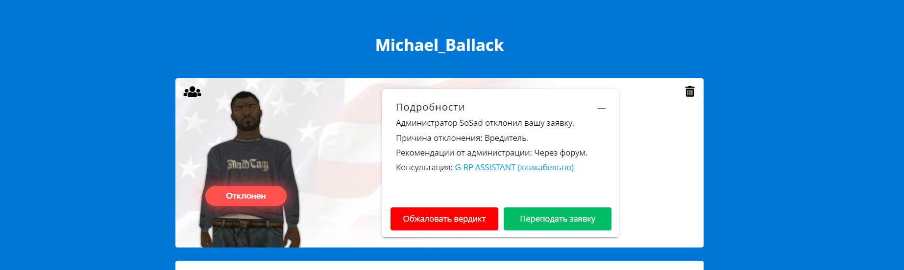 Суть жалобы: отклонили заявку на создание персонажа мол вредитель когда первый раз захожу на гамбит
