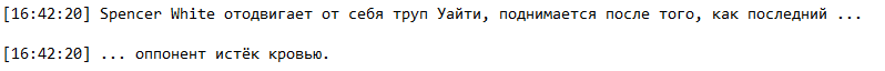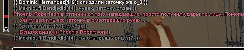 2. Как я указал раннее "начинает всех резать", но! Он не успевает зарезать последнего (нас 3/их 2) и мой соигрок отыгрывает как забирает нож у того из рук. Spencer_White в свою же очередь решил проигнорировать действие моего соигрока и дождаться пока тот истекёт кровью дабы продолжить ситуацию, сохранить нож и выйти победителем из ситуации.