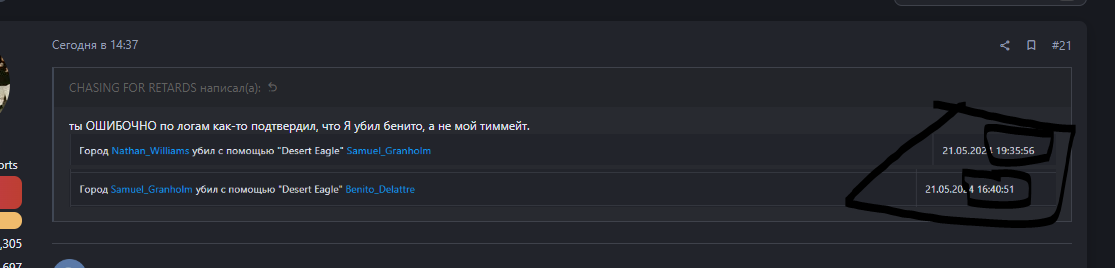 Ссылка на доказательства наказания/нарушения: https://forum.gambit-rp.ru/threads/501858/, https://forum.gambit-rp.ru/threads/501755/#post-6265147