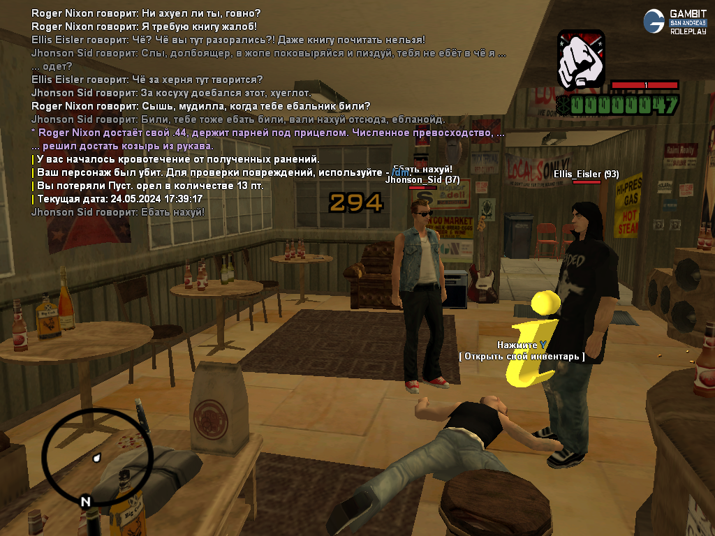 Суть жалобы: зашёл в игру после длительного перерыва. заехал в бар, мой персонаж закусился с барменом и решил помереться силой. сотрудников бара было двоя, то тогда персонаж мой решил уже похвастаться револьвером наставив его на двоих парнюг. элисс берёт и убивает моего перса будучи под прицелом. попахивает пг, не кажется?