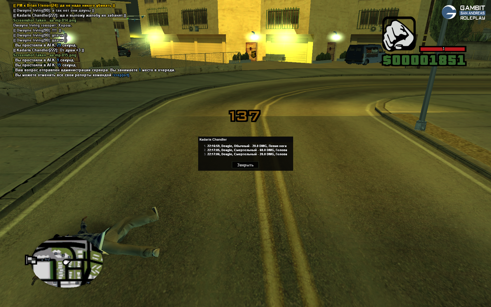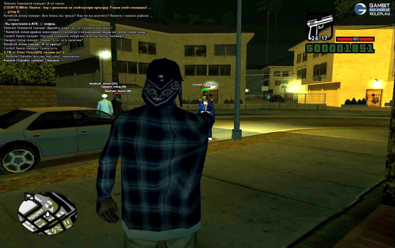 Начинается все с того что я просто стою на айдлвуде, мирно себе играю и никого не трогаю, до меня доебалась компания этих недобросовестных игроков, играющих хуйню. Они говорят мне - чтоб я проваливал с их улицы, хуй знает с каких пор, я просто стоял и никого не трогал, я решил как аргумент своей правды достать оружие, и разогнать шпану, я им говорю чтоб они свалили, в ответ на что они начинают бегать под прицелом пушки вместо того чтоб сесть в свой султан и уехать под угрозом оружия. Судя по всеми - игроки не умеют проигрывать в ситуациях
