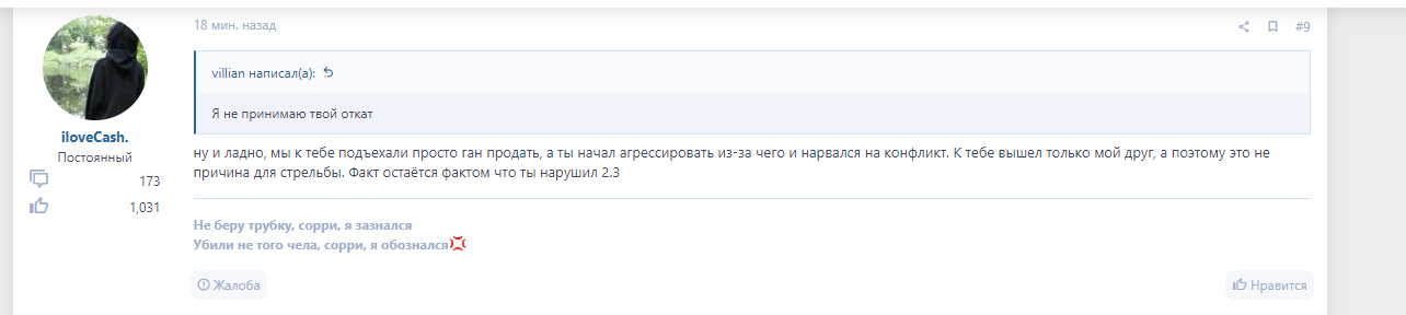Суть жалобы: Администратором был проигнорирована ложь игрока и моё право стрельбы по игрокам, которые численным преимуществом угрожают мне.