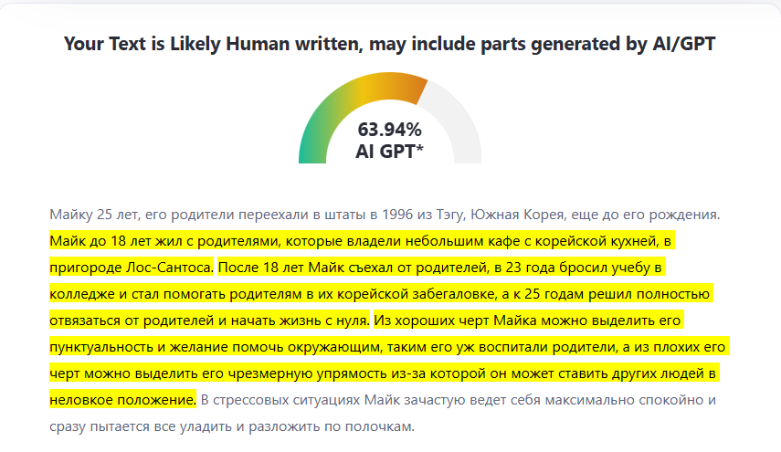 Суть жалобы: Я писал квенту своими руками, не знаю почему AI GPT показал 63.94, но я писал ее с нуля, слегка опираясь на свою старую квенту, это НЕ нейросеть, что делать в такой ситуации?