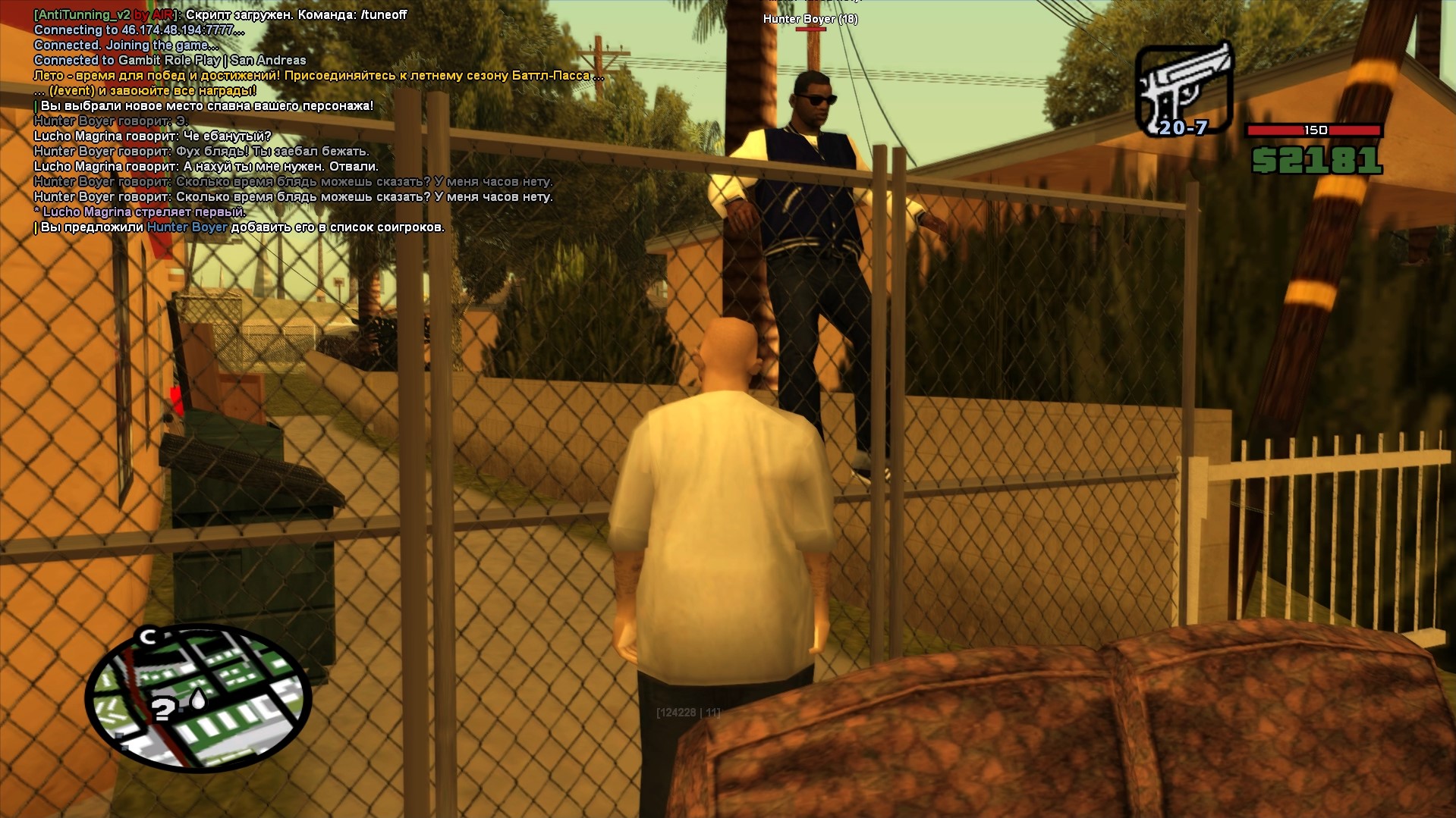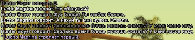 Суть жалобы: Ситуация такова : я стоял на джефферсоне, и пробежал данный игрок, я спросил у него, сколько времени? Он побежал дальше, ну и я за ним, я не причинил ему никакую опасность, прибежали на гэнтон, и я сказал, типо, остановись, сколько времени?? Он дальше побежал, залез через ограждение, и отыграл просто /me стреляет первым, хотя я даже не отыграл что доставал оружие, и не причинял опасности, экстр ситы так же не было , я просто хотел узнать время. И данный игрок даже нормальную отыгровки не применил, и убил меня за то что я хотел узнать время.
