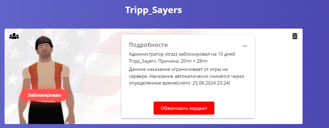 Суть жалобы: блокирует меня на 3 дня и на 20 моего соигрока. Суть ситуации - мы совершали похищением в брухасе девушки, она тянула ситуацию. В это время, к нам подбежала лиса, которая нападает на моего персонажа, я отыгрываю, что стреляю в лису, по итогу на наш репорт на игрока Melanie_Creespy прилетает xtrazz и и спрашивает про отказ от игры. в это же время подбегает эта лиса и случаются роковые события. я стреляю, внимание, не в лису, а просто рядом, НЕ В НЕЁ САМУ, а в рядом, если администратор забанил меня за это, то он обязан приложить доказательство этого, потому что я не фрапсил игру. мой соигрок стреляет уже в саму лису, откидывая её в первую стадию, мы закидываем мелани в багажник и уезжаем на гору брухаса. администратор не учитывает, что у животных есть ножи на гамбите, администратор не учитывает нарушения других игроков в лице МГ, отказа от игры и добивания во 2 стадию без отыгровки и неотыгрыш ранений. он банит меня и моего соигрока. не великолепно ли? появляется вопросы о его как таковой компентености. при рассмотрение также прошу учесть мою историю наказаний, которая практически чистая, за исключением некоторых моментов.