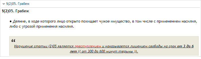 короч, многие наверн в курсе, что в калифорнии (а мы играем его аналог) есть закон, что грабеж до 950$ считается мелким проступком и за него не полагается арест. вопрос: а почему у нас такого нет? =(