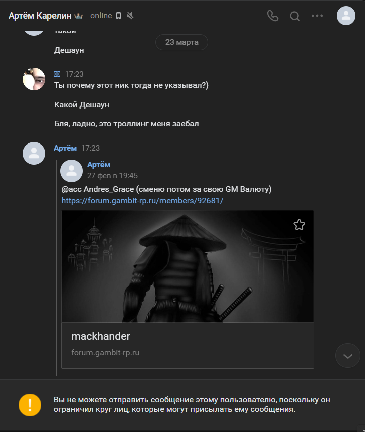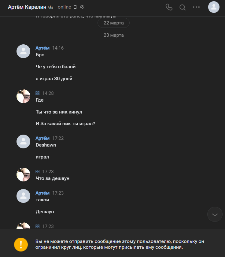 Так, посмотри сверху я сказал хочу вернуться играть за него топик, у тебя в чс я думал ты не следящий за этимБлокировка за отказ от реабилитации. Мы с тобой уже общались. Говори сразу - это ебучий троллинг или ты реально не понимаешь, почему у тебя бан за отказ от реабилитации?)
