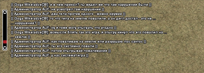 Администратор AUF видел всю ситуацию, но просто забил на то, что в ней есть нарушения. После чего я зашел с другого персонажа (т.к. на этом у меня пк) и позвал его поговорить, благодаря чему у нас состоялся диалог, в котором администратор полностью показал свое непонимание игры.