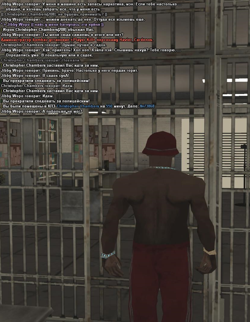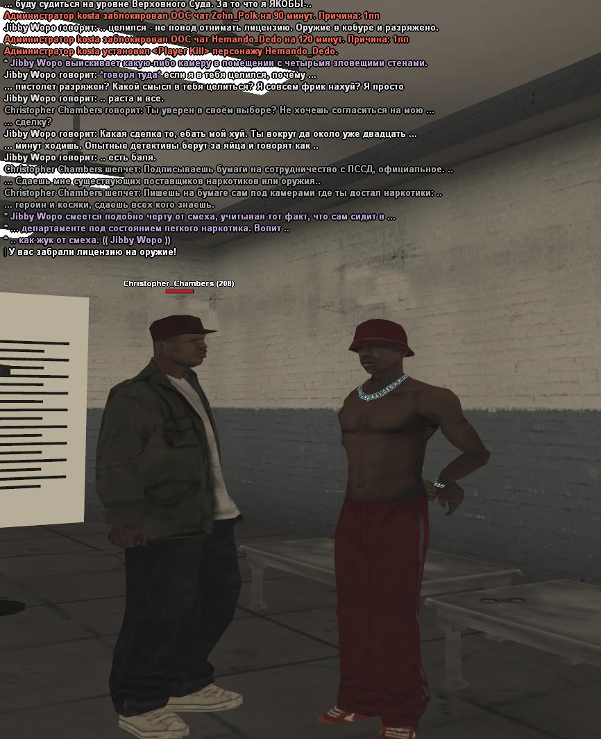 Что в принципе и произошло. Видно, что игрок фракции неопытный, раз играет подобным качеством. В айси, без каких-либо ООС высказов с моей стороны, тому поступил ответ, мол нет, я не буду становится информатором. В ответ на это, обвиняемый игрок СРАЗУ ЖЕ в течении 1 секунды прописывает команду /takelic. Ни какой-либо игры на то, что мы учавствуем в процессе изъятия лицензии (процесс, который должен занимать недолгое время, как никакая игра), вообще ни-че-го. Ну и под конец, обвиняемый решил отобрать у меня пистолет с патронами (на что у него не получилось, он мне заспамил весь чат предложением с обыском, что у меня перестал выскакивать текстдрайв). Попытался в садок посадить - тоже не получилось. В итоге посадил на 550 минут. Скажите мне, как можно попасть в локальную тюрьму на 550 минут , без лицензии, при том, что это минимум от того, что намеревался сделать обиженный игрок?