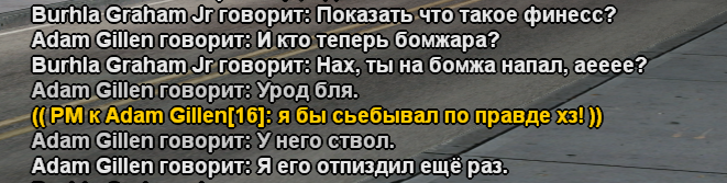 Человек бегает за Адамом с глоком + нападает на него и это не угроза жизни + говорит про какую-то фракцию Бубтон. Бро ты очень старнный и не воздухать а дай ответ, нахуя ты приехал и стоял с человеком которого мы грабили не коси под д3б#ла