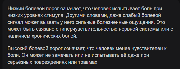 Скажу как студент-медик, что ты немного ошибся. Пониженный болевой порог это наоборот сильная чувствительность к боли