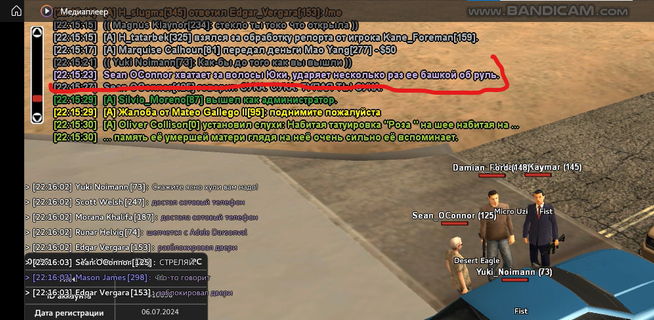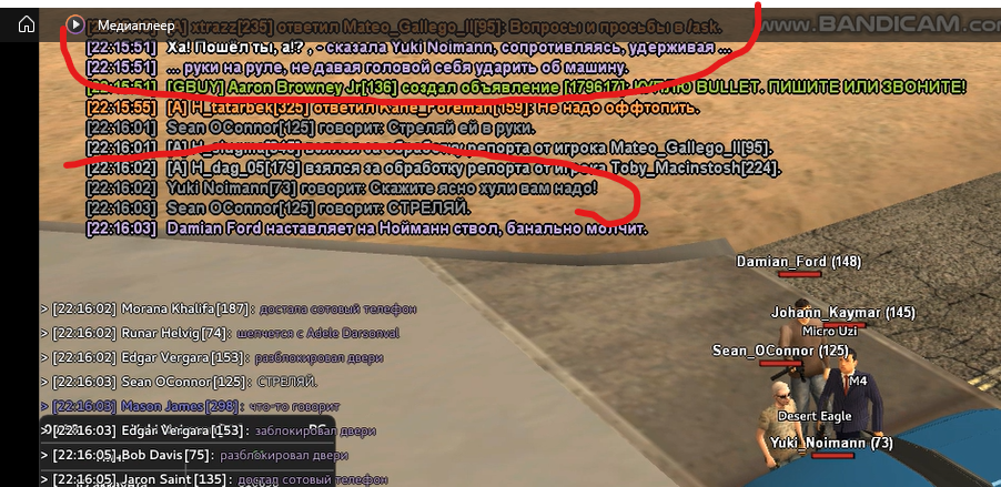 На "Большом Ухе", когда мой персонаж хотел заняться обычным заездом без особых угроз, неожиданно появляется седан с 3-мя людьми в нём, причём с оружием. Не замечая этого, моя спокойно остановилась и подготовилась к гонке, что впрочем обернулось требованием выйти из машины и не только. Я сразу понял что не так, а потому через /rep вызвал админа для слежением за ситуацией. Сразу-же один из людей на той ситуации без толкового понимания что и как сразу выдал действие, суть которого: "Вытянул за волосы и положил в багажник". Нормальная отыгровка? Нихера!