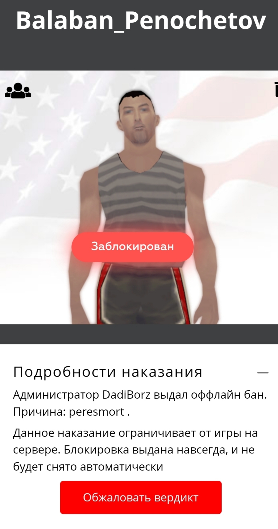 Суть жалобы: Здравствуйте хотелось бы попросить амнистию на аккаунт Balaban_Penochetov и также увидеть доказательства что я сделал на айбан